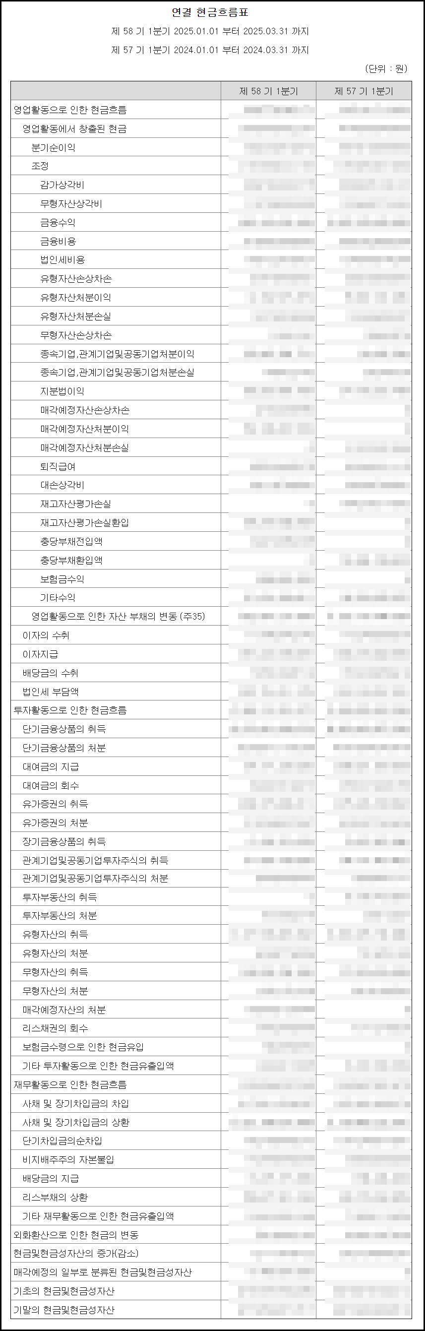 실제 현금이 어디서 들어오고 나갔는지 보여줘요. 수익은 있어도 현금이 없을 수 있기 때문에 중요해요. | 영업활동현금흐름, 투자활동, 재무활동 |